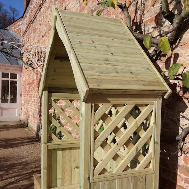 The trellis back and sides are ideal for climbing or trailing plants, helping it blend beautifully into your garden. With its classic pitched roof and curved detailing, it adds charm and character to any outdoor space while seating two people comfortably.
