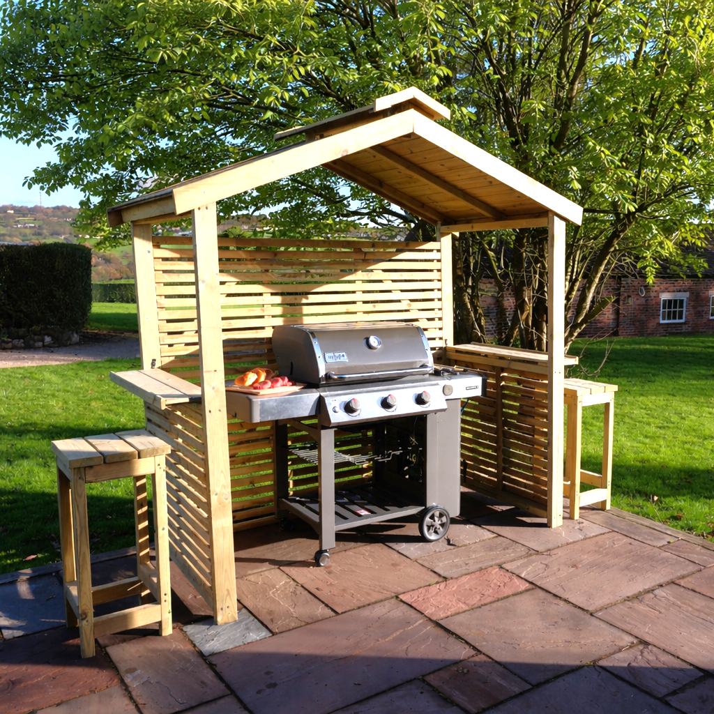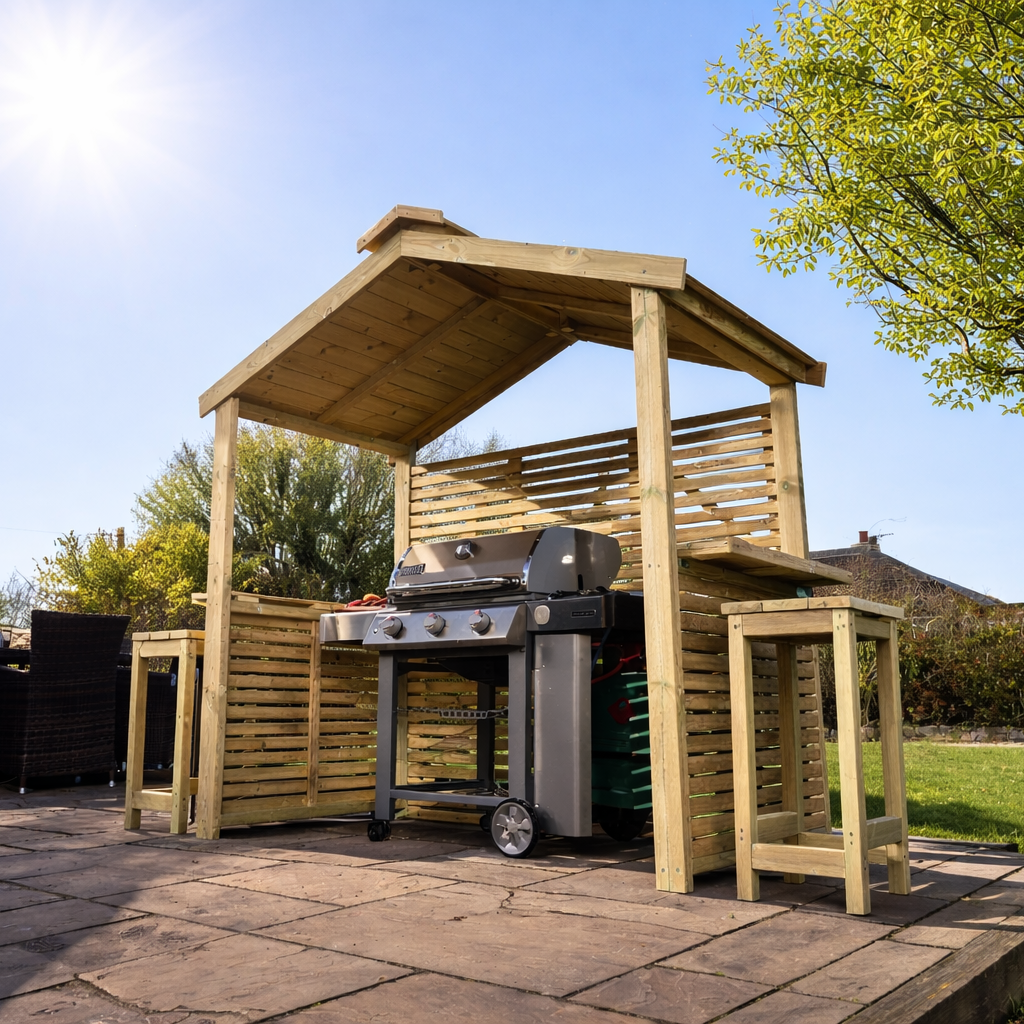 The Grill & Chill BBQ Hut will take your BBQs to the next level with it's spacious design and natural charm. It’s the perfect way to create a dedicated grilling area in your garden while adding a touch of character to your garden. Designed with an apex roof and beautifully detailed horizontal patterned side panels. It’s a great size and the perfect height for comfortable cooking whilst offering shelter.