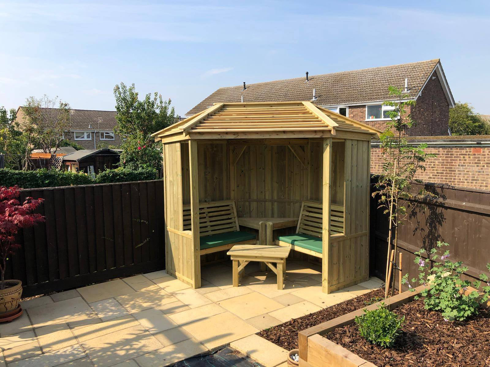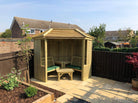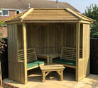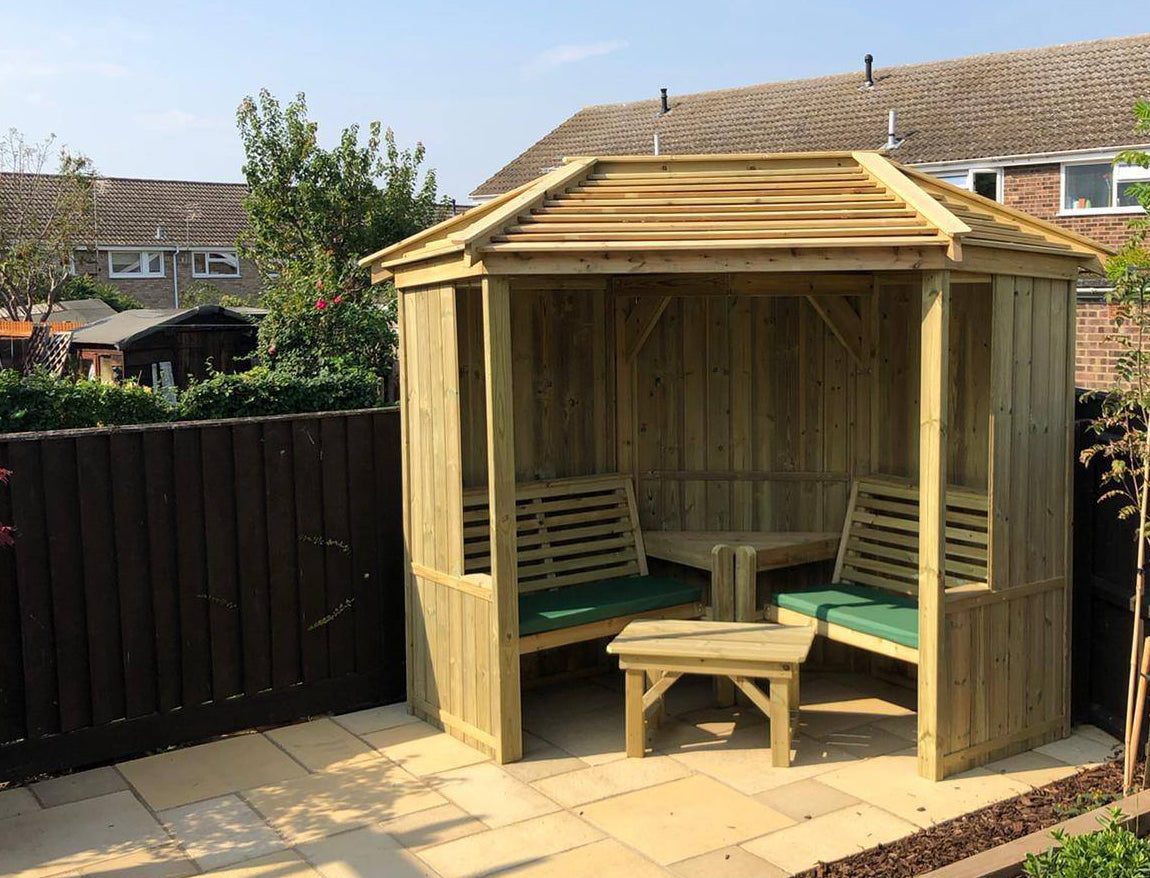This hand crafted garden room, comes complete with a Louvre style wooden slatted roof which allows some shelter from sun and light showers, it is fully pressure treated for longevity and is fitted with two comfortable benches which will sit a total of four adults. There is a functional corner table where you can put your drinks, and you can also purchase a coffee table for a discounted price with this beautiful product. Cushions, footstools and planters pictured can also be purchased as optional extras. Coffee Table AC1Square Planters (PL1)