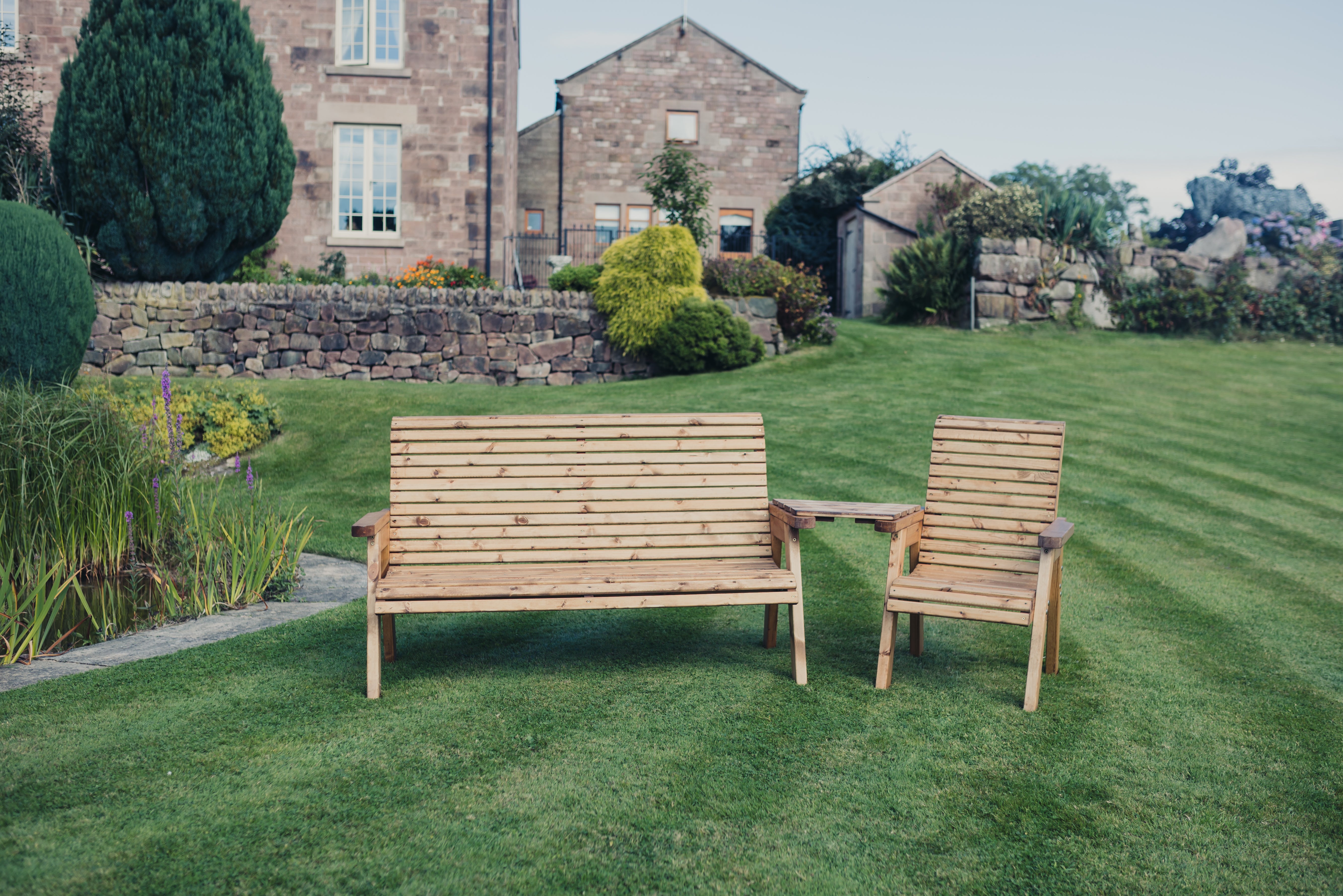This is a lovely valley styled 4 seat set angled, made to sit four people with 1 x chair and 1 x 3 seat bench with a removeable angled tray table. This beautiful brown bench set has been built by British craftsmen in this unique style using the finest Swedish Redwood. Timber has been pre-treated with a basecoat offering antifungal, mould and also UV protection.