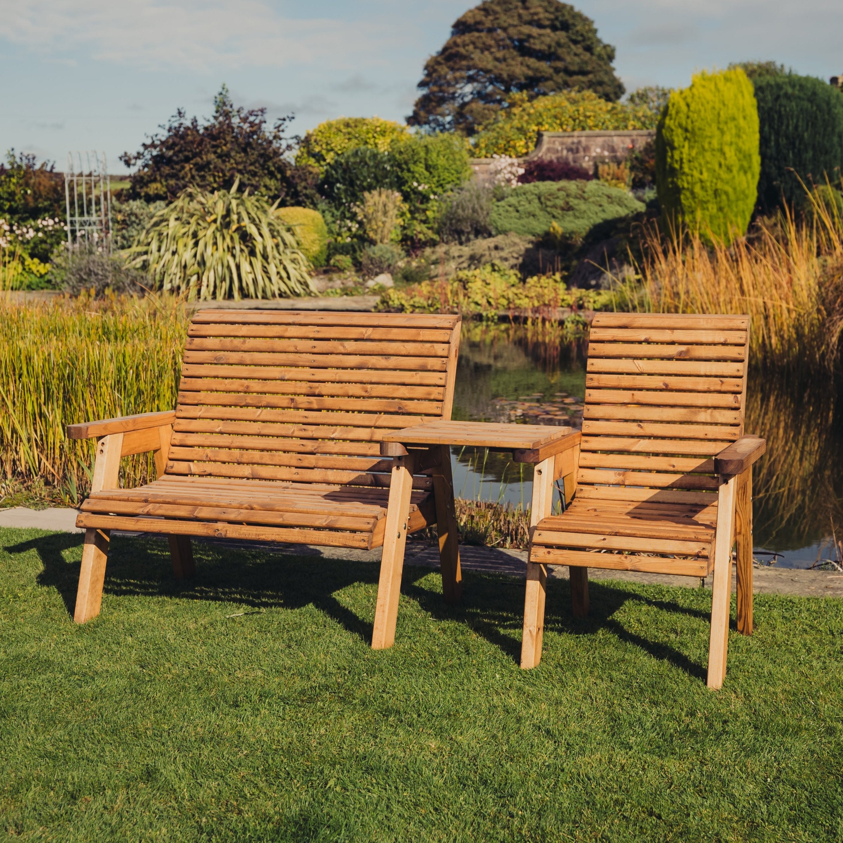 Our furniture is eco-friendly because we only use wood from Scandinavian forests that are managed responsibly by the Forestry Stewardship Council (FSC). This means that when trees are cut down, more are planted in their place. We also take the extra step of having our wood pressure-treated to protect it against weather for many years. Most garden furniture today is made to last only three or four years, but our products are built to last almost four times longer, which helps protect the planet's natural resources.