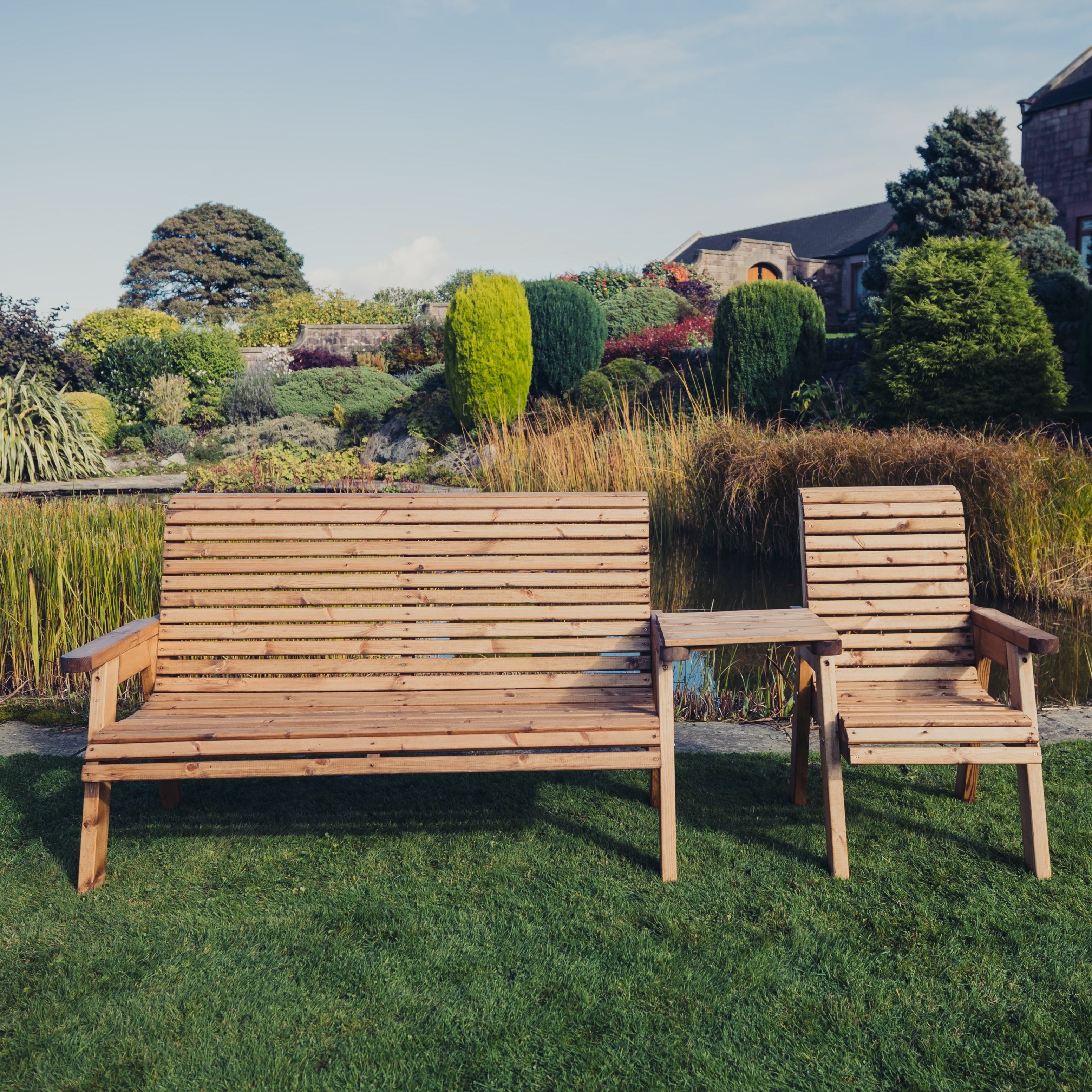 This is a lovely valley styled 4 seat set straight, made to sit four people with 1 x chair and 1 x 3 seat bench, with a removeable straight tray table. This beautiful brown bench set has been built by British craftsmen in this unique style using the finest Swedish Redwood. Timber has been pre-treated with a basecoat offering antifungal, mould and also UV protection.