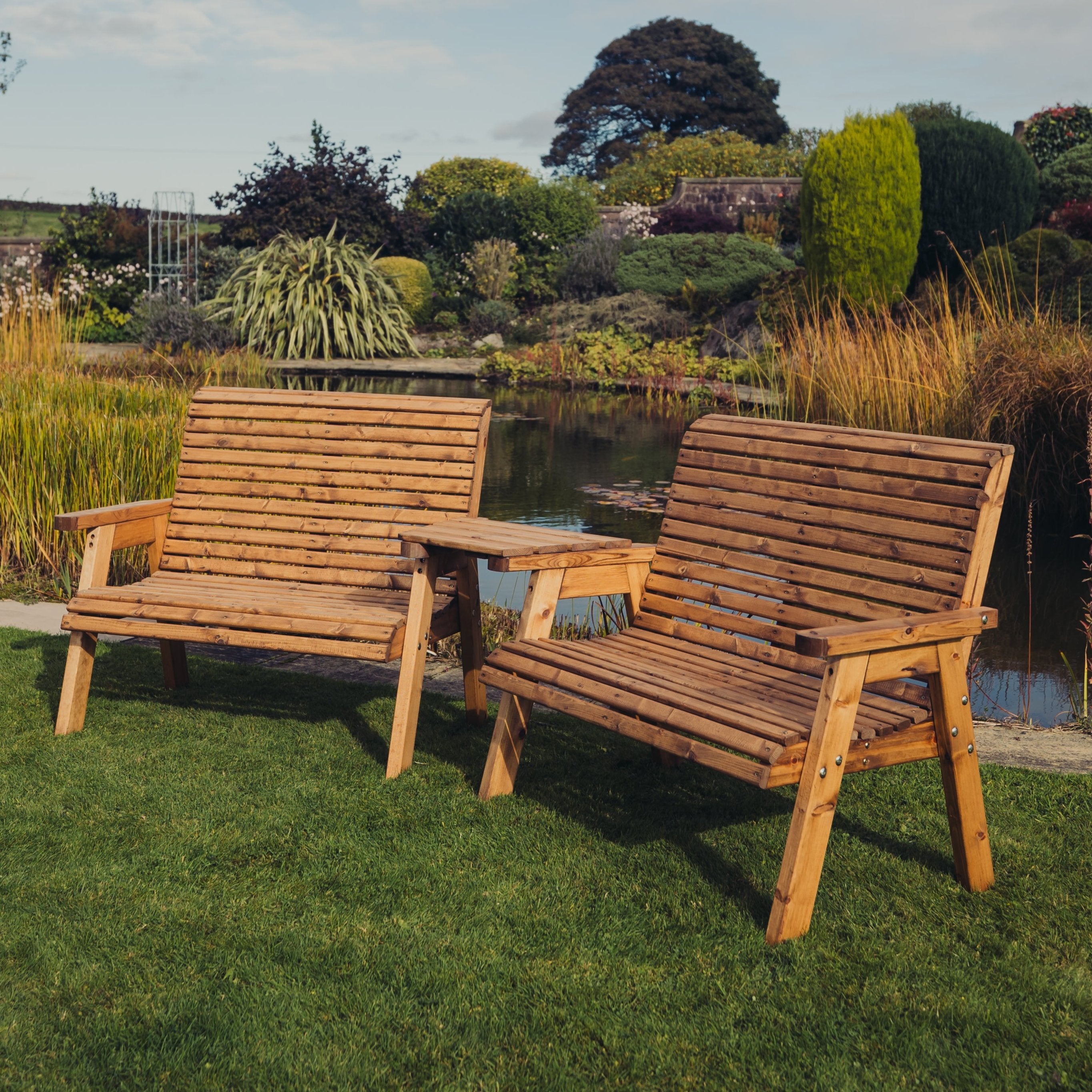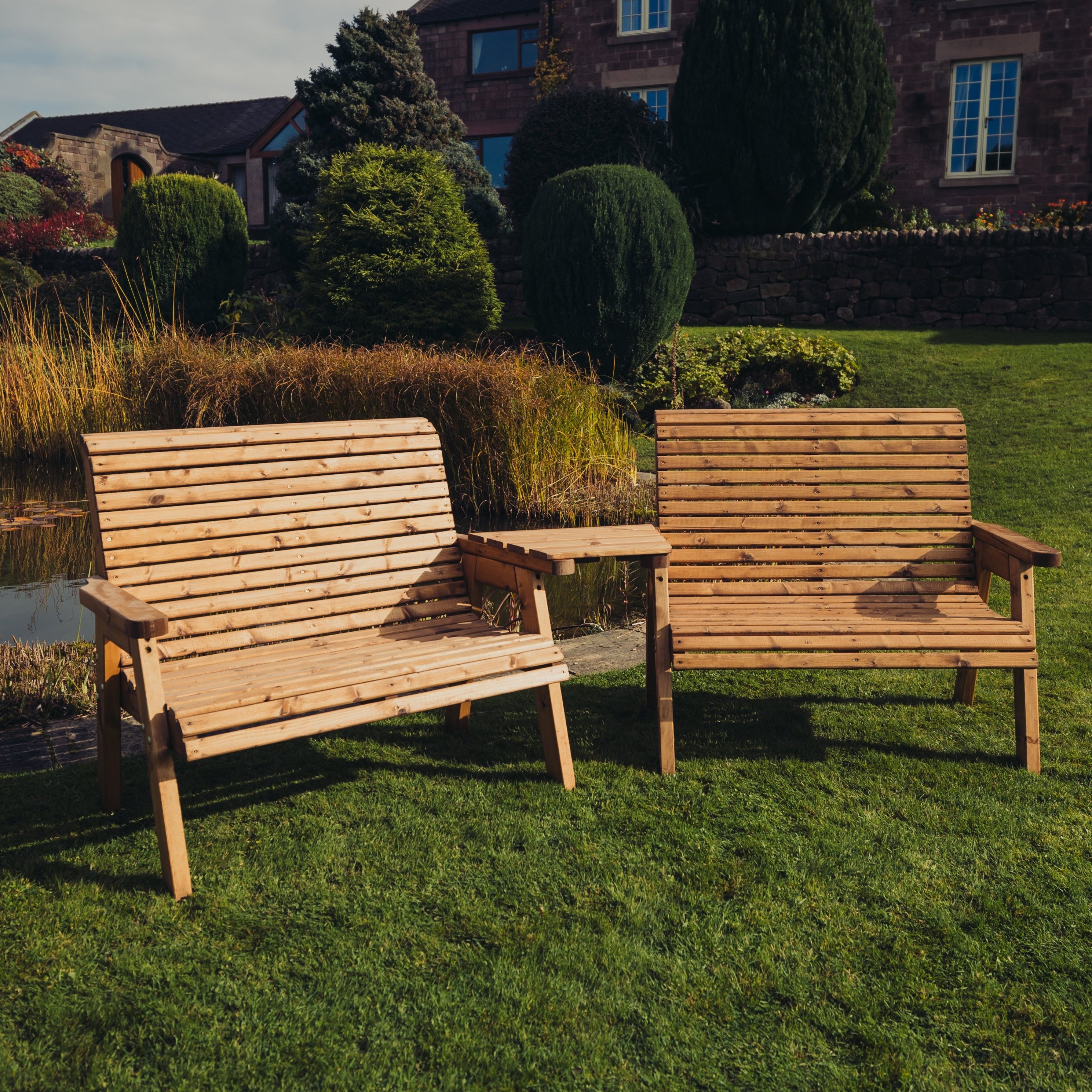 This is a lovely valley styled 4 seat set angled, made to sit four people with 2 x 2 seater benches. This beautiful brown bench set has been built by British craftsmen in this unique style using the finest Swedish Redwood. Timber has been pre-treated with a basecoat offering antifungal, mould and also UV protection.