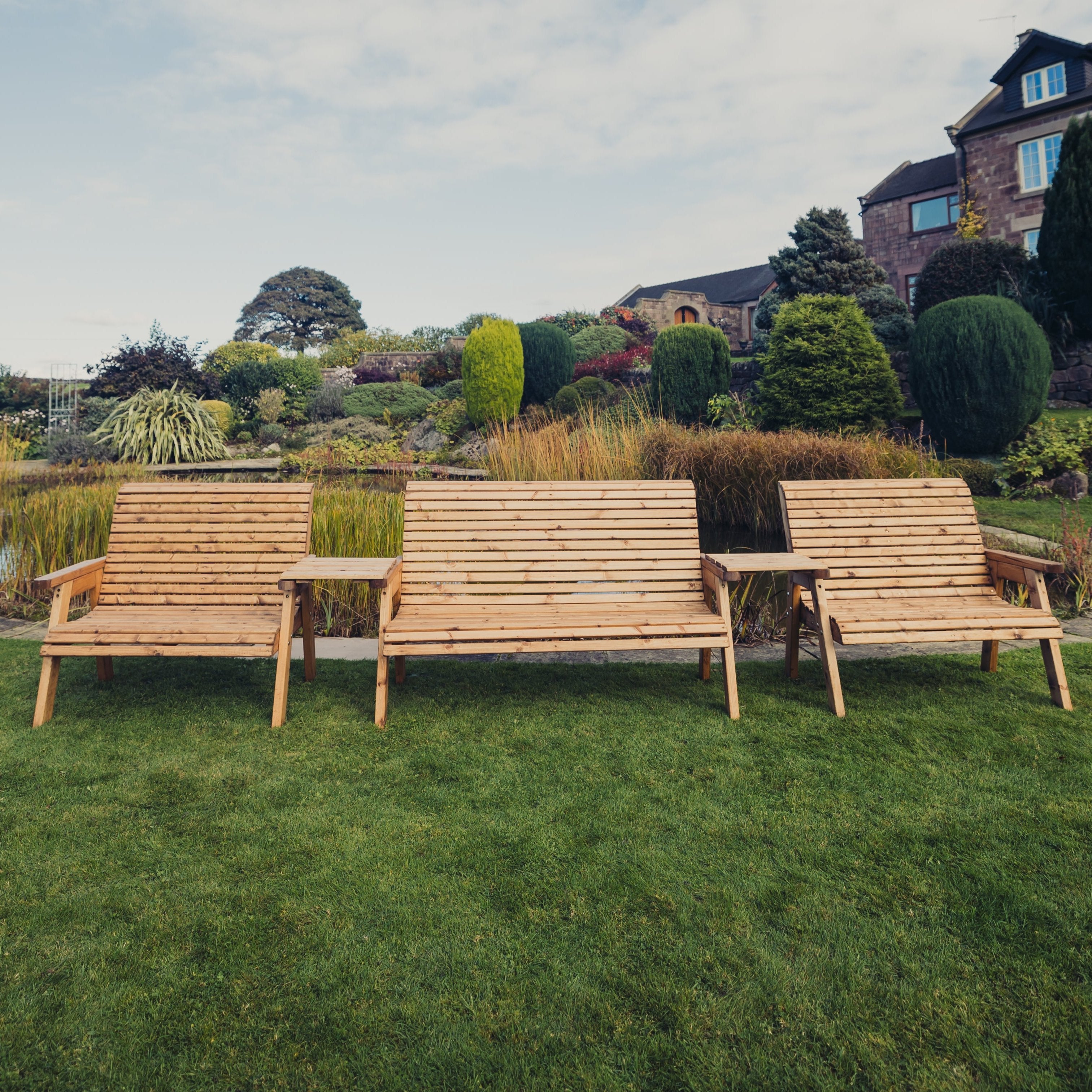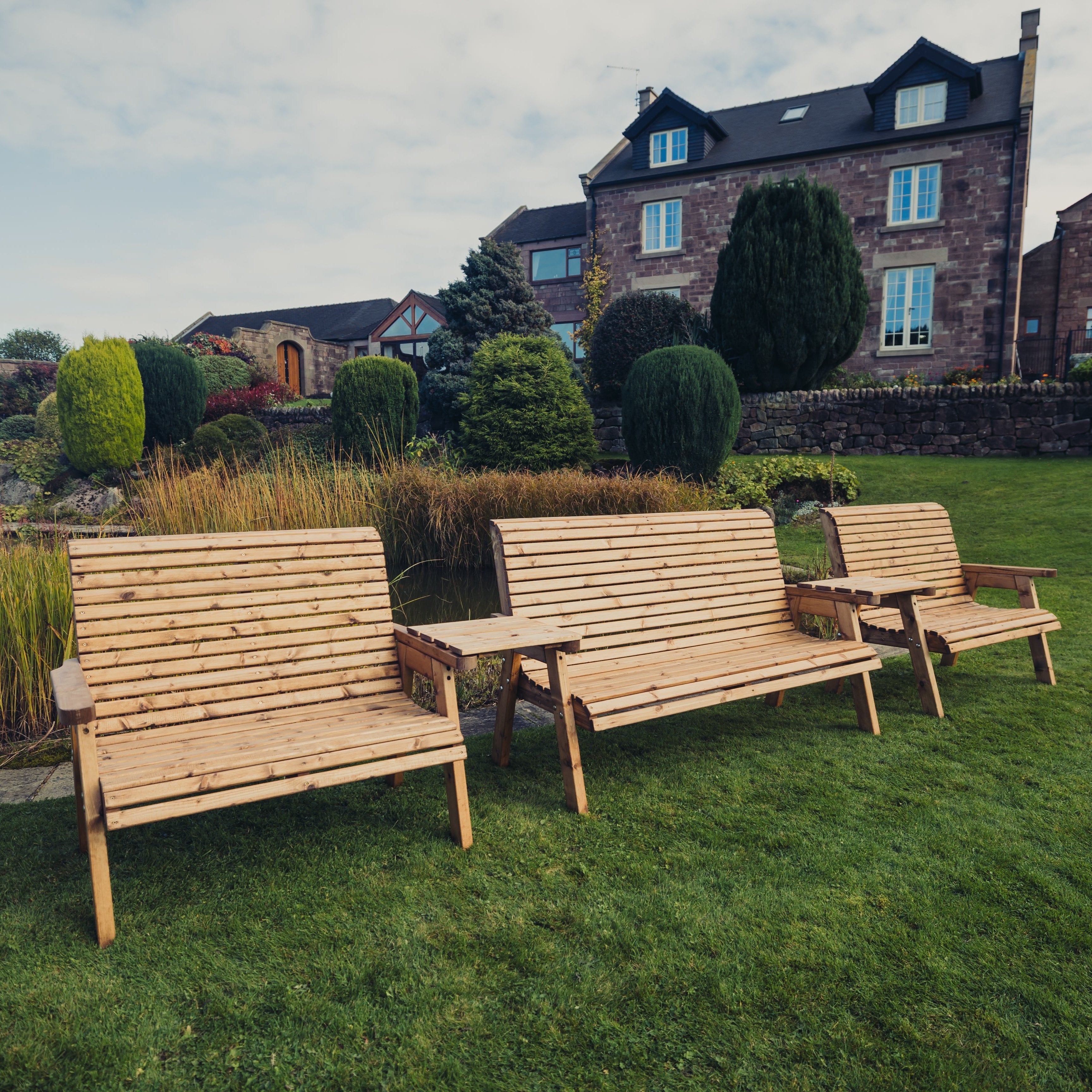 This is a lovely Valley styled 7 seat set straight set, made to sit seven people with 1 x 3 seater bench and 2 x 2 seater benches with straight tray tables. This beautiful brown bench set has been built by British craftsmen in this unique style using the finest Swedish Redwood. Timber has been pre-treated with a basecoat offering antifungal, mould and also UV protection.