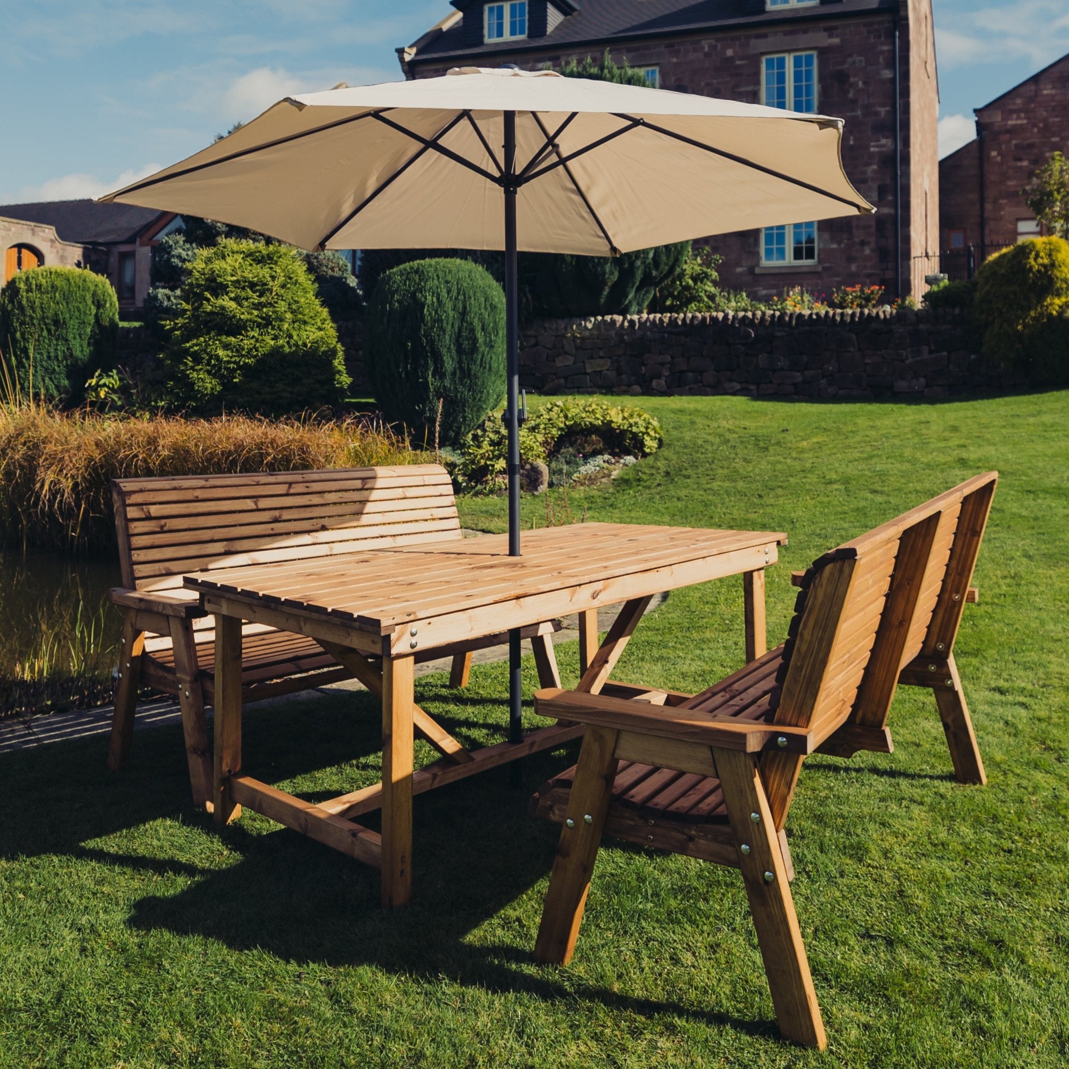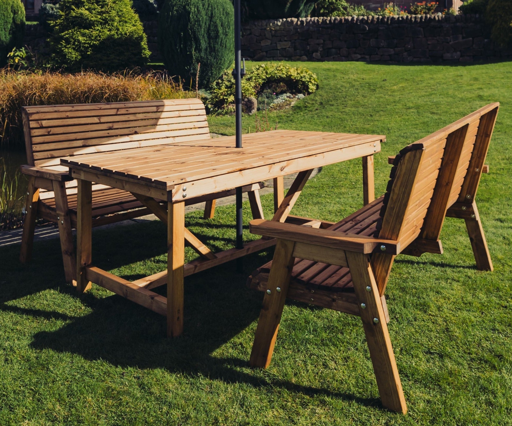 Wooden high quality brown garden set handmade in North Staffordshire. Get the best British made garden products from Churnet Valley Garden Furniture where we make quality wooden garden products using the finest Scandinavian Redwood which is pre-treated.