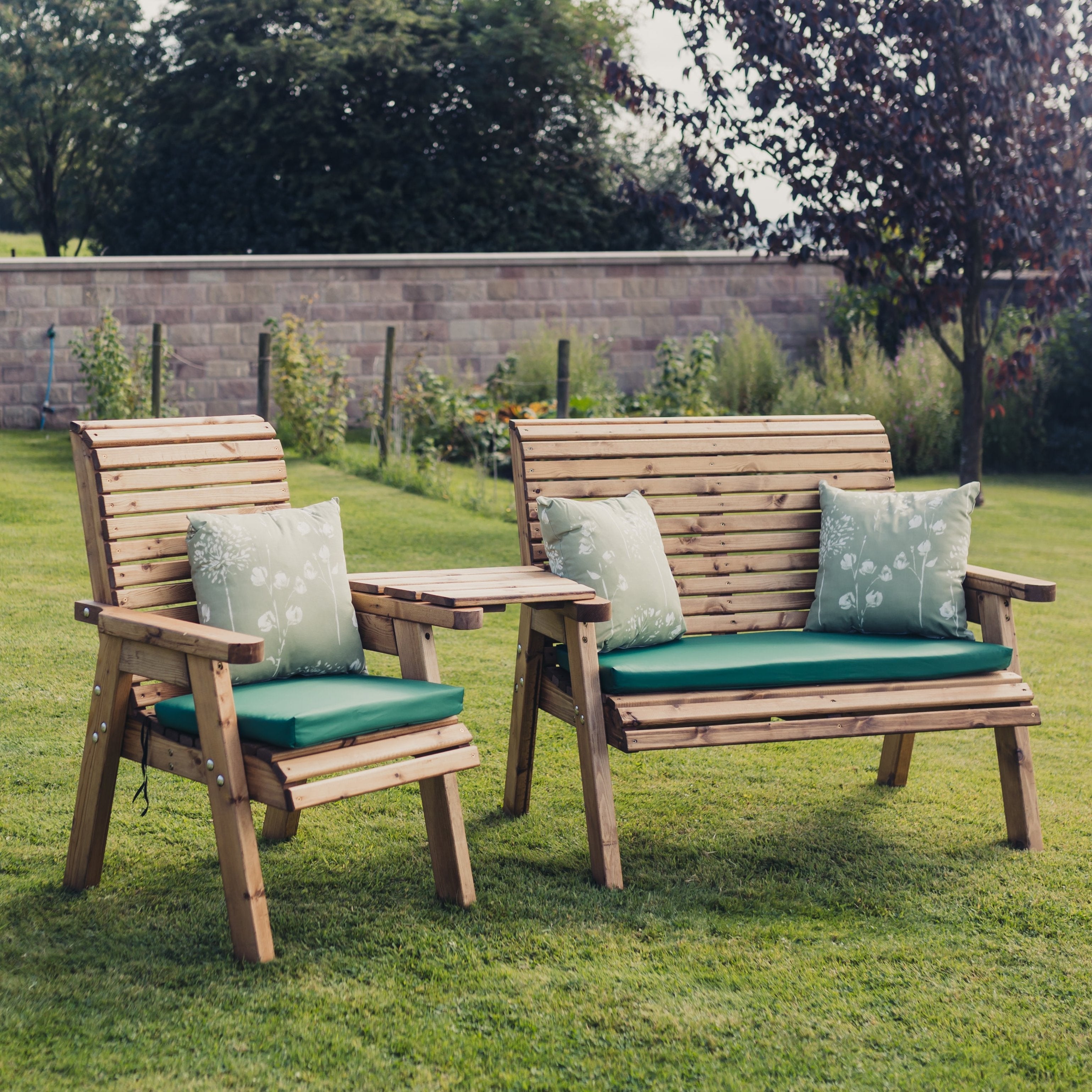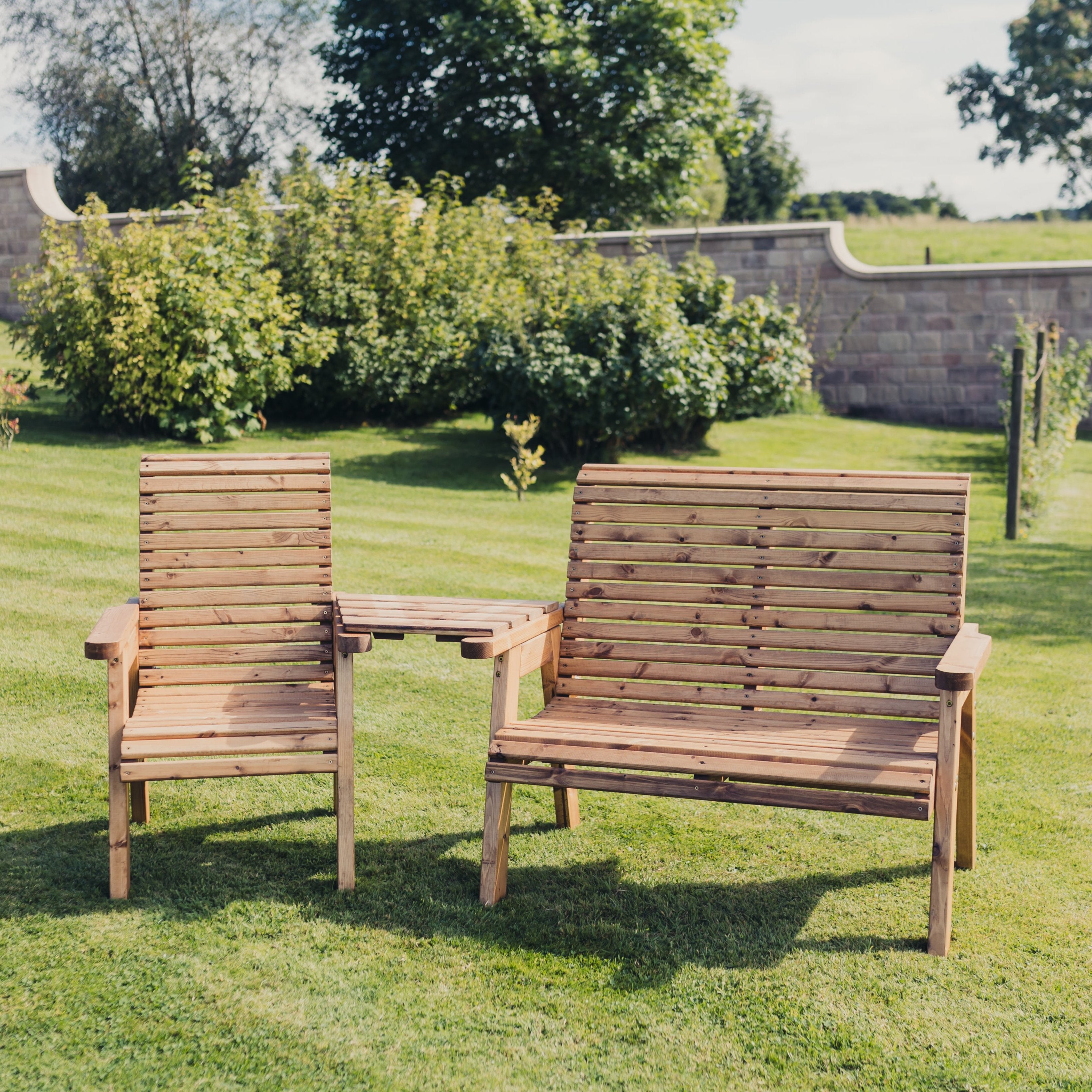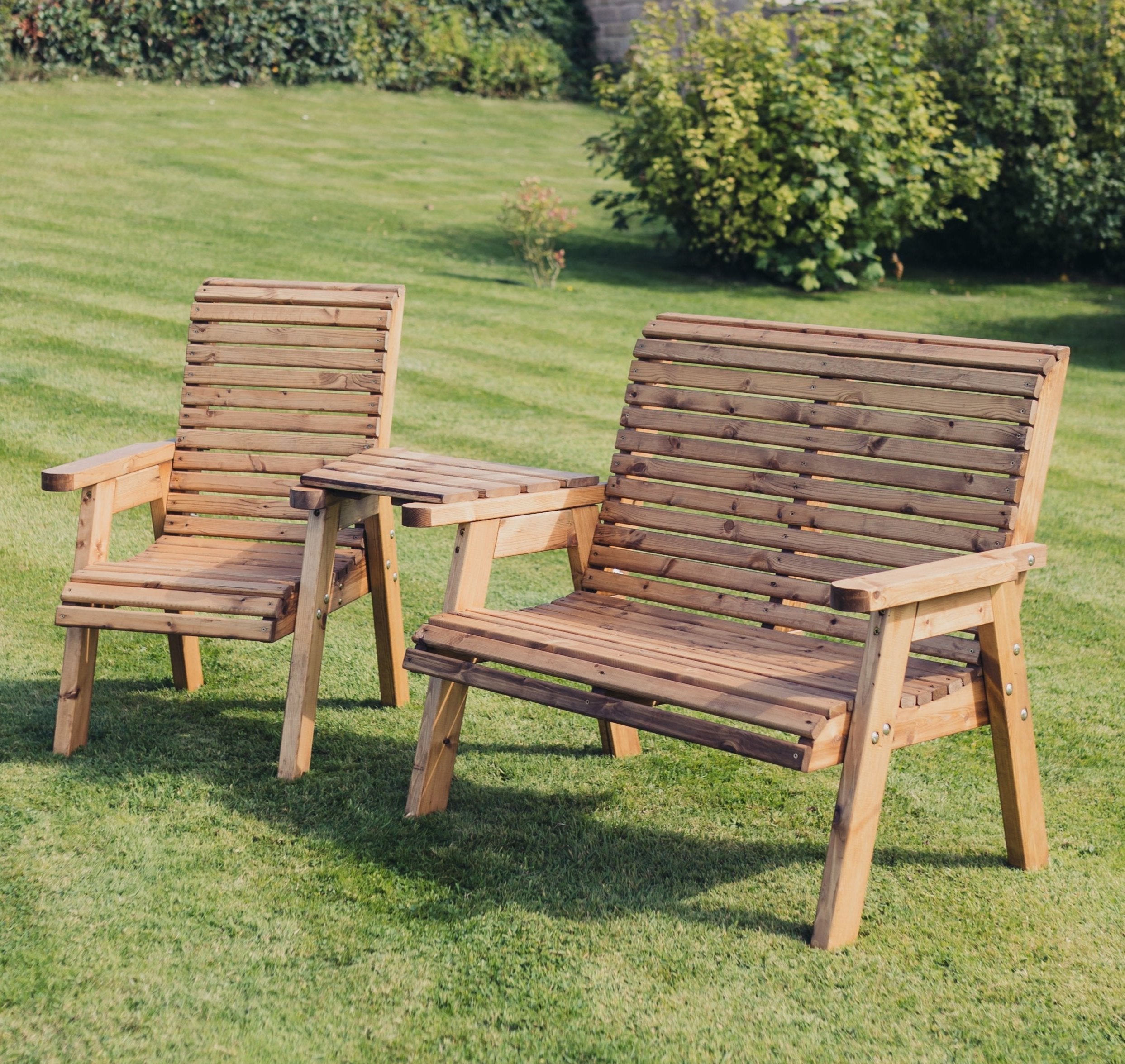 This is a lovely valley styled trio set angled, made to sit three people. This beautiful brown trio set has been built by British craftsmen in this unique style using the finest Swedish Redwood. Timber has been pre-treated with a basecoat offering antifungal, mould and also UV protection.