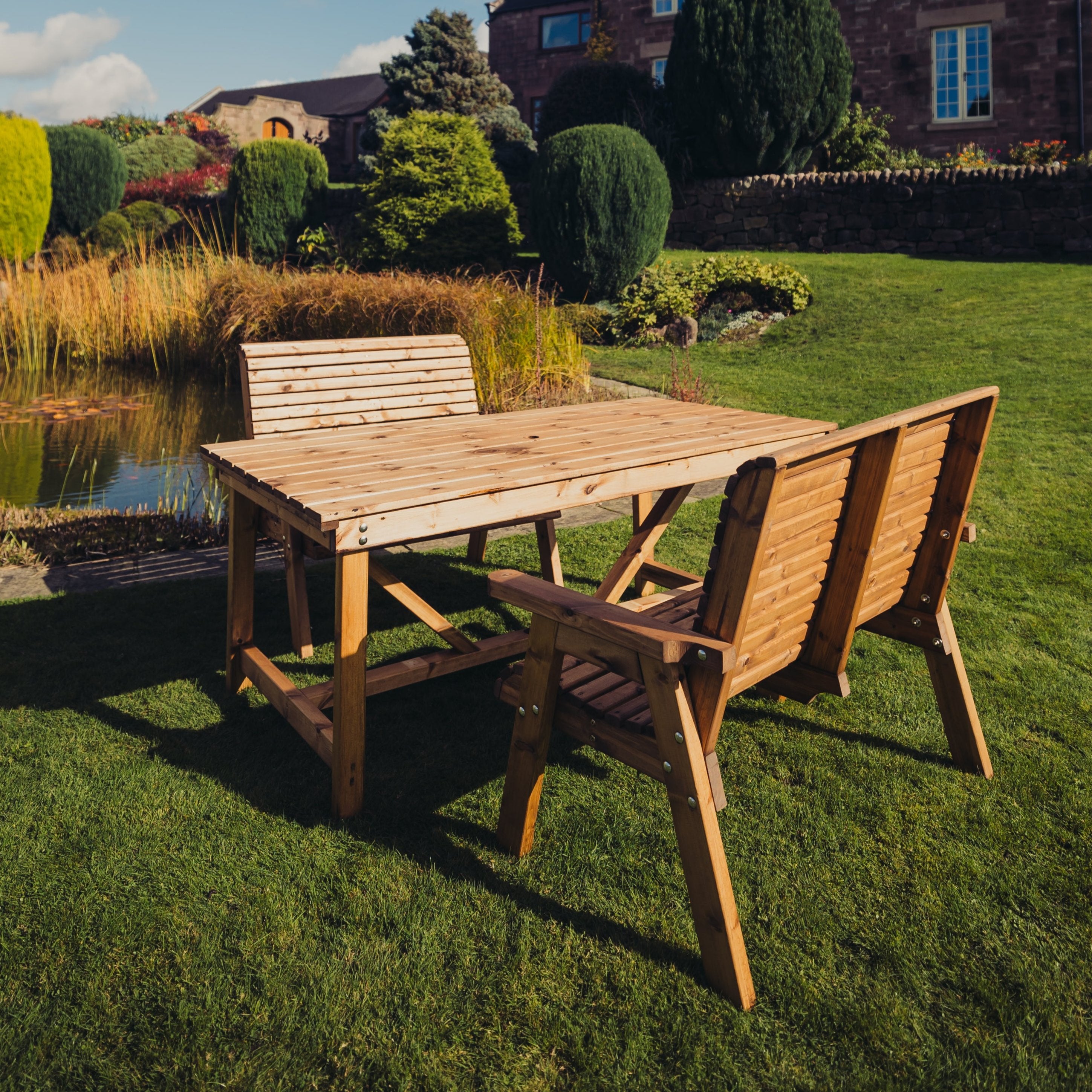 Wooden high quality brown table set handmade in North Staffordshire. Get the best British made garden products from Churnet Valley Garden Furniture where we make quality wooden garden products using the finest Scandinavian Redwood which is pre-treated.