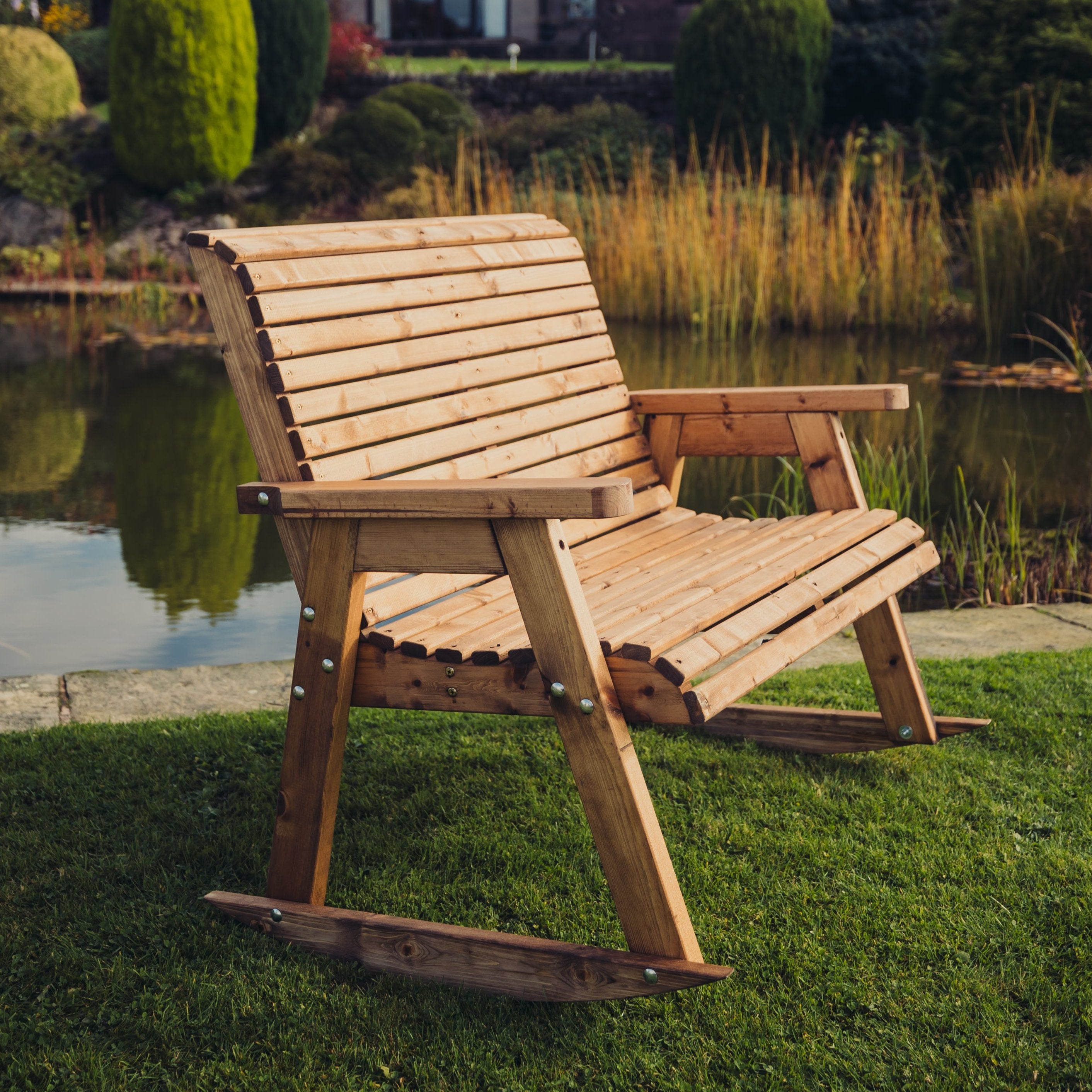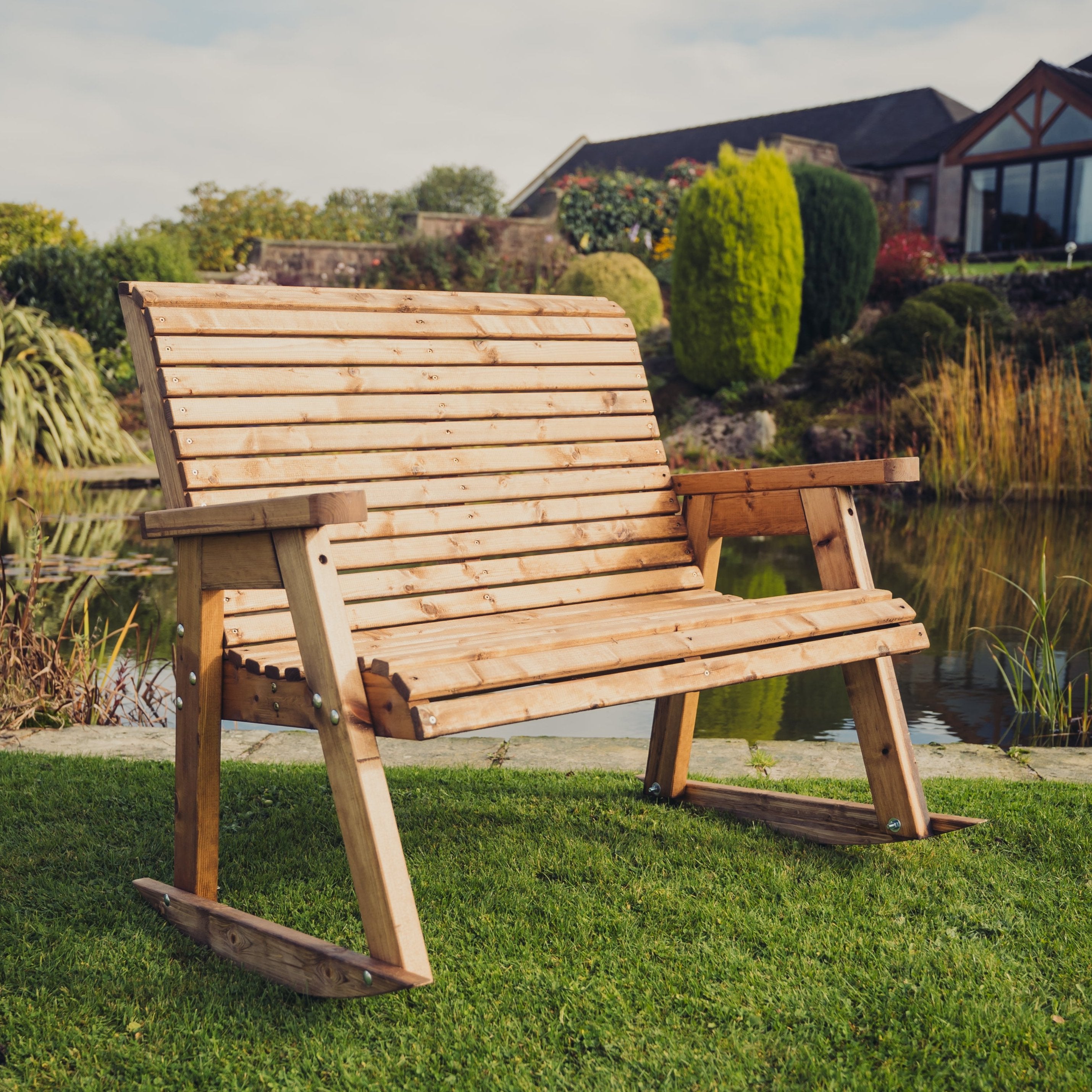 This is a lovely valley styled brown rocking bench, made to sit two people. This beautiful rocking bench has been built by British craftsmen in this unique style using the finest Swedish Redwood. Timber has been pre-treated with a basecoat offering antifungal, mould and also UV protection.